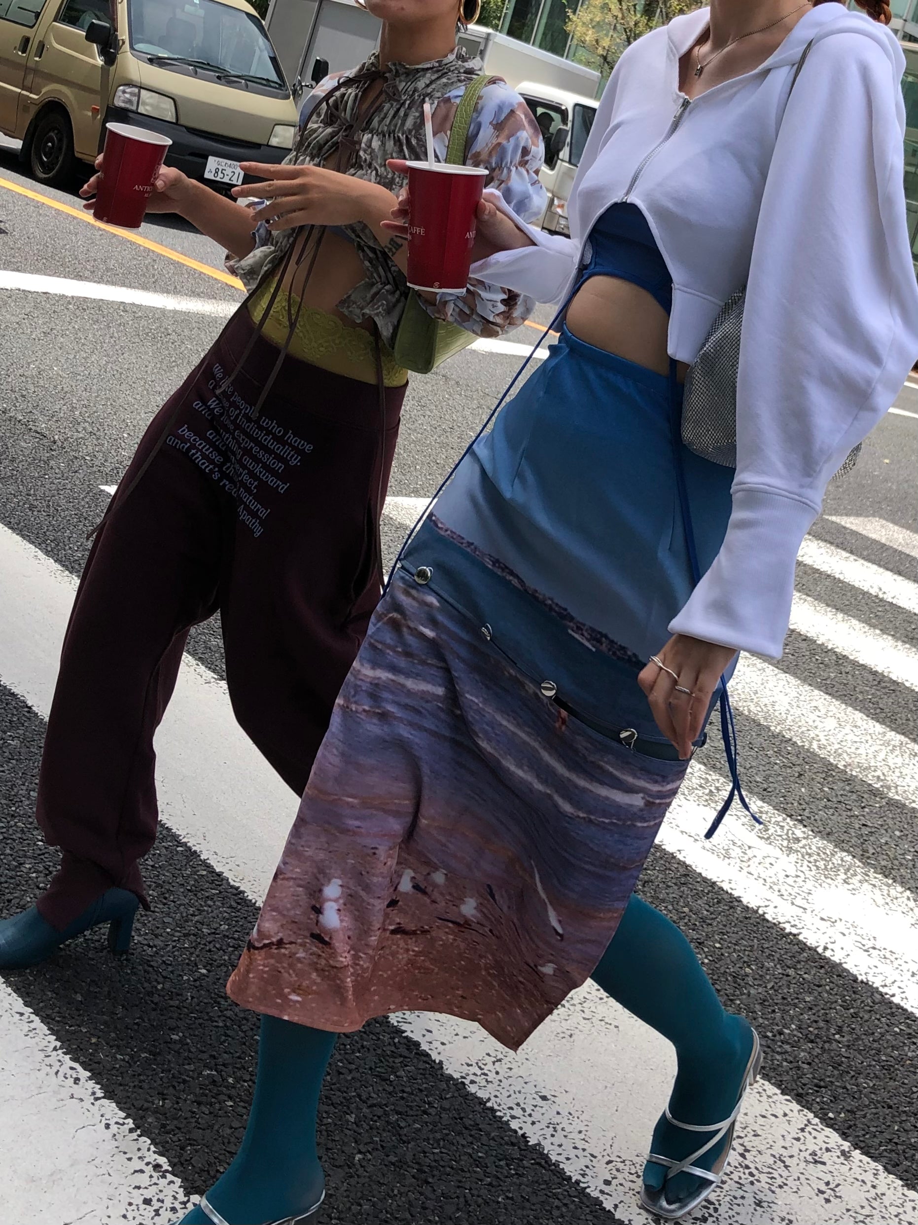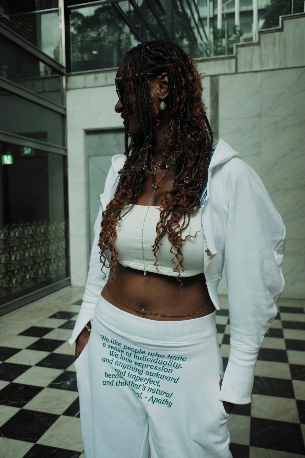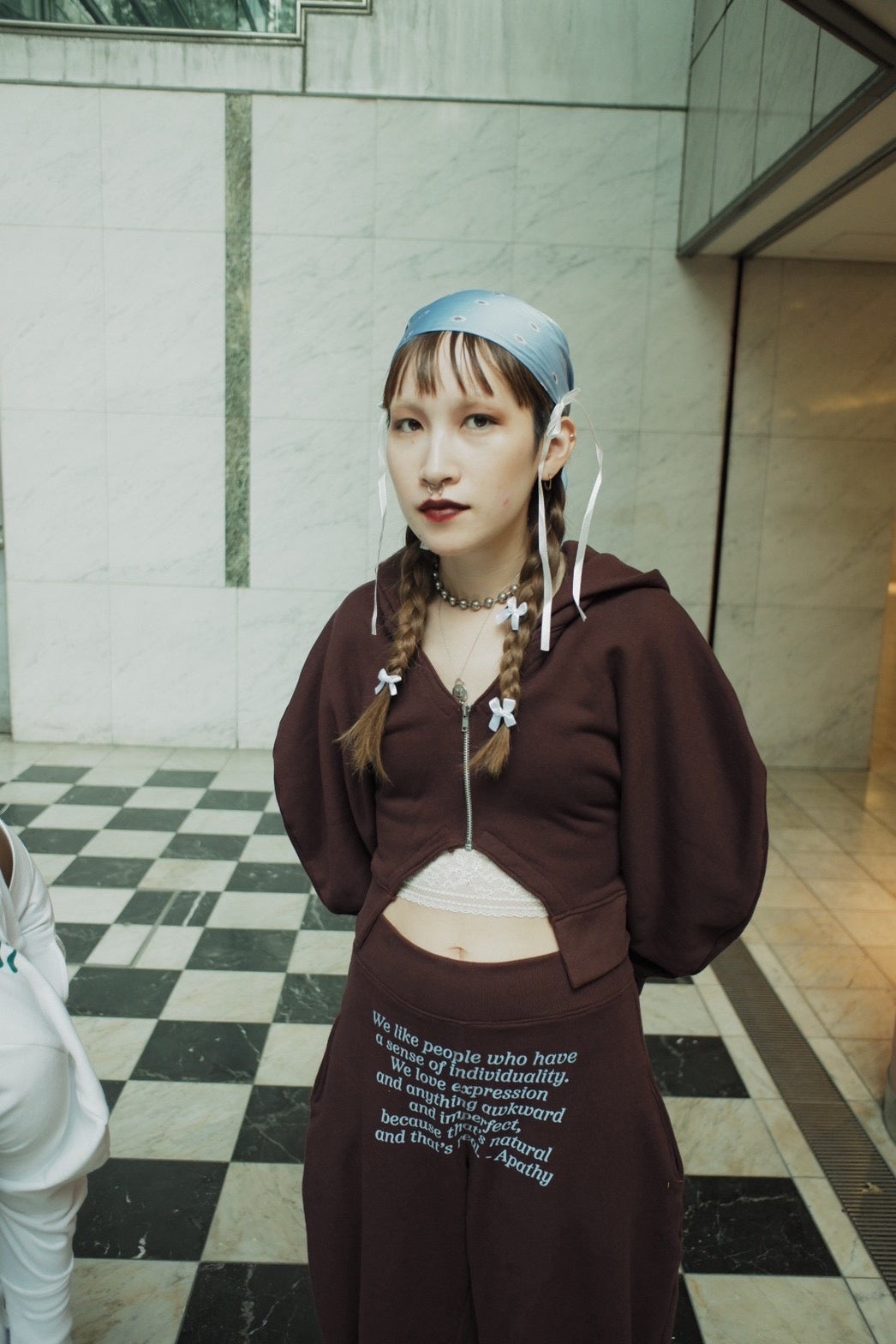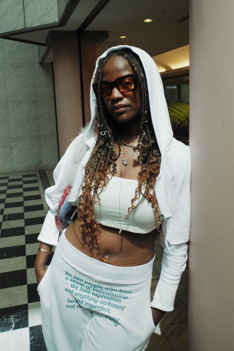 The hoodie is short and designed to show off the volume of the sleeves, making it easy to balance with bottom as the hoodie is made to show off the neck and stomach.