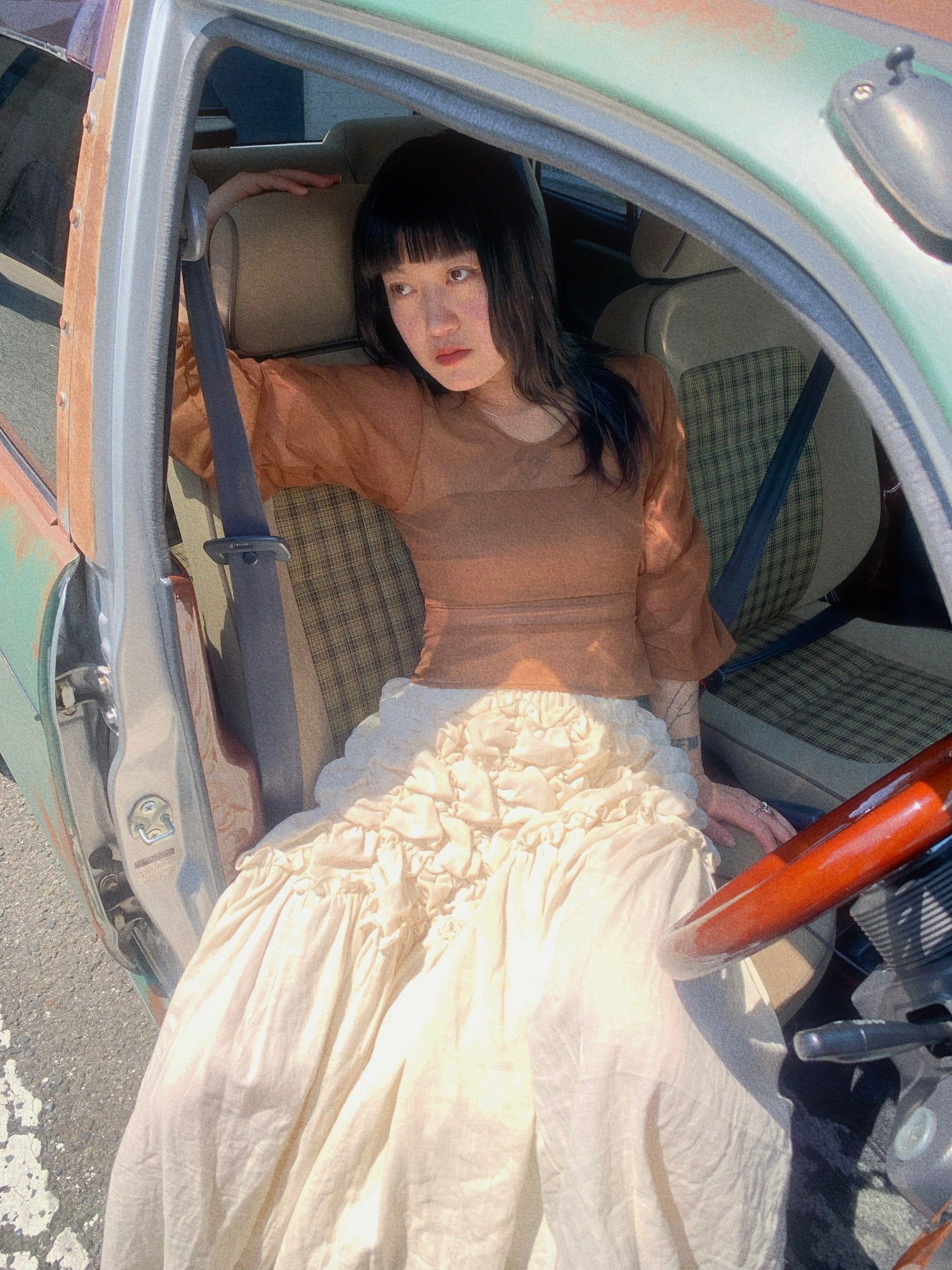 落ち着いたブラウンカラーで大人びた印象ですが、袖はギャザーの仕様でフェミニンさがプラスされています🥂✨